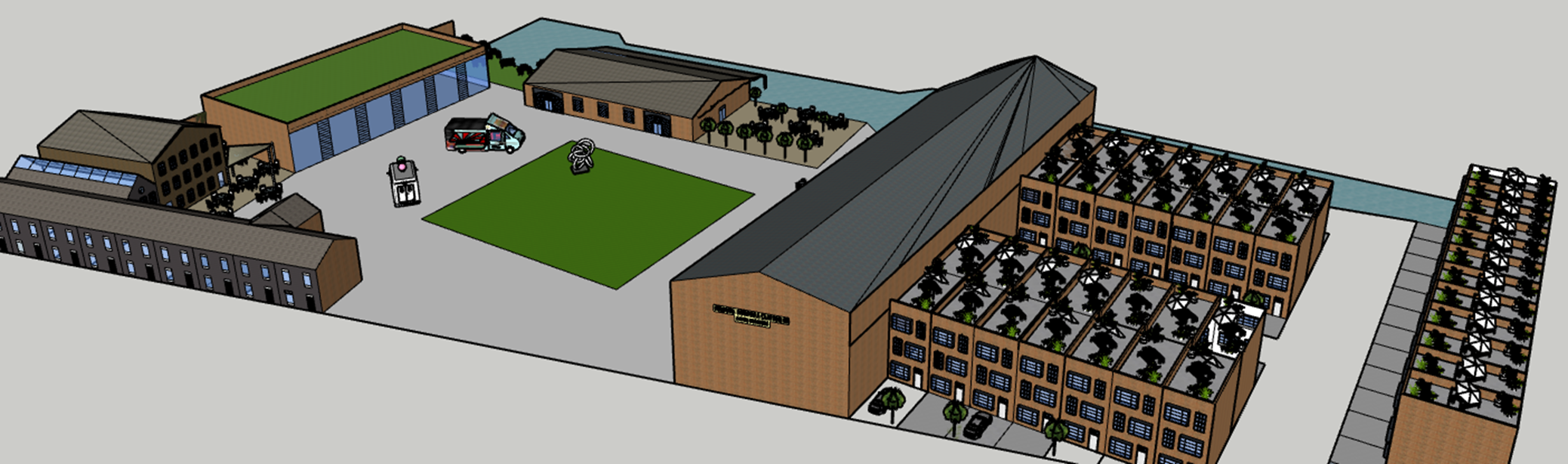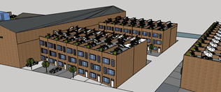 We have taken inspiration from the Berkeley home urban scheme and have created 40 modern homes with on street parking at the South East end of the site. Each house will have an allotment on the roof of the houses in which they can create and design their own private garden. There will also be an independent convenience store located nearby.